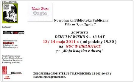 Filia nr 5, os. Zgody 7 zaplanowała z 13/14 maja 2011 r. kolejną już Noc w Bibliotece pt. „Moja książka z duszą” . W czasie spotkania poprzez przeprowadzone konkursy, zajęcia animacyjno-czytelnicze ukazane zostaną możliwości twórczego wykorzystania tekstu literackiego. Przewidziano również grę „terenową”, której celem będzie odkrycie kufra z książkami.