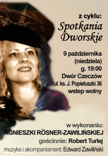 Od lirycznych kawałków po drapieżne melodie z paryskich scen. O tęsknocie, nadziei i miłości zaśpiewa podczas "Spotkań Dworskich" Agnieszka Rösner-Zawilińska, artystka kabaretu Loch Camelot, laureatka III Ogólnopolskiego Festiwalu Piosenki Kabaretowej O.B.O.R.A. w Poznaniu, nagradzana wielokrotnie przez publiczność. W repertuarze znajdą się aranżacje tekstów między innymi Bolesława Leśmiana, Wisławy Szymborskiej, Juliana Tuwima, Adama Ziemianina i Edith Piaf.