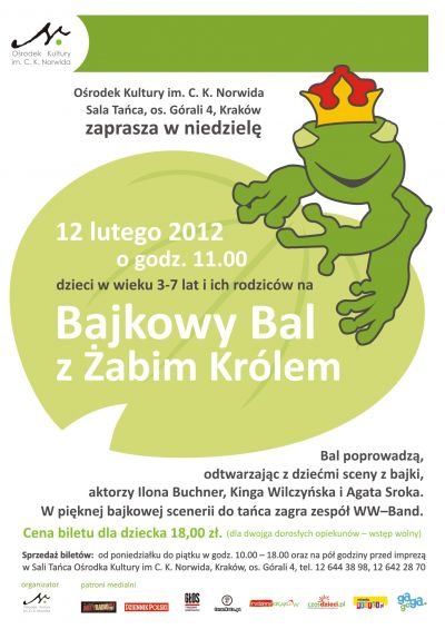 Cena biletu dla dziecka 18,00 zł. ( dla dwojga dorosłych opiekunów wstęp wolny). Sprzedaż biletów od poniedziałku do piątku w godzinach 10.00 – 18.00 w Sali Tańca Ośrodka Kultury im. C. K. Norwida, os. Górali 4, Kraków, tel. 12-644-38-98, 12-642-28-70.