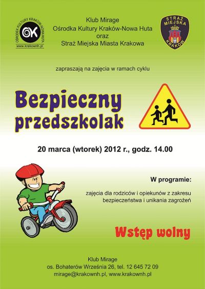 Klub Mirage Ośrodka Kultury Kraków-Nowa Huta (os. Bohaterów Września 26) zaprasza 20 marca (wtorek) 2012 r. o godz. 14.00 na kolejne zajęcia z cyklu Bezpieczny Przedszkolak.