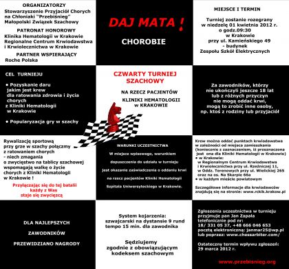 1 kwietnia o godz. 9:30 przy ul. Kamieńskiego 49 w Krakowie zostanie rozegrany wyjątkowy turniej szachowy pod hasłem „Daj MATA chorobie”. Celem turnieju jest pozyskanie daru, jakim jest krew – dla ratowania zdrowia i życia chorych z Kliniki Hematologii w Krakowie, a także popularyzacja gry w szachy.