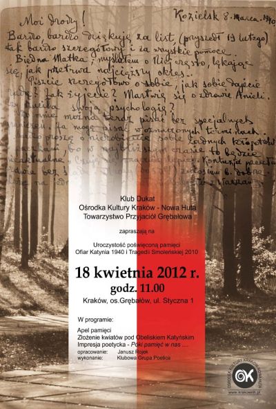 Klub Dukat Ośrodka Kultury Kraków-Nowa Huta (ul. Styczna 1) zaprasza na uroczystość poświęconą pamięci Ofiar Katynia i Tragedii Smoleńskiej, która odbędzie się 18 kwietnia 2012 r. (środa) o godz. 11.00.