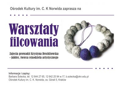 Zapraszamy osoby początkujące, ale także takie, które mają podstawy już za sobą. Na naszych zajęciach wykonujemy biżuterię i przedmioty z filcu, awangardową biżuterię z czesanki wełnianej - naszyjniki z kulek filcowanych na mokro oraz naszyjniki z dredów, koralików, sznurka, drucika – wykonane różnymi technikami.