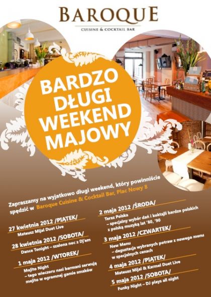 W dniach 27 kwiecień – 5 maj krakowski Baroque Cuisine & Cocktail Bar zaprasza na Bardzo Długi Weekend Majowy na Placu Nowym 8! Muzyka na żywo, najlepsze koktajle i wyśmienita kuchnia – to tylko najważniejszych atrakcji jakie będą czekać na wszystkich, którzy te dni postanowią spędzić w Baroque na Kazimierzu!