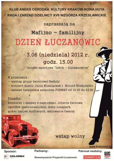 Klub Aneks Ośrodka Kultury Kraków-Nowa Huta oraz Rada i Zarząd Dzielnicy XVII Wzgórza Krzesławickie zapraszają mieszkańców Łuczanowic oraz innych krakowskich osiedli na rodzinna imprezę plenerową. W programie festynu, który przeniesie uczestników w klimat lat 20-tych, znajdzie się między innymi koncert Julii Miesiączek i Witolda Niedojadło - półfinalistów programu Must be the music. Tylko muzyka, występ zespołu baletowego Gaduły czy Formacji Aneks. W tematykę imprezy przybyłych wprowadzą specjalnie przygotowane konkursy – m.in. na najlepszy list gończy, portret gangstera, z wiedzy o najsłynniejszych agentach wszech czasów.
