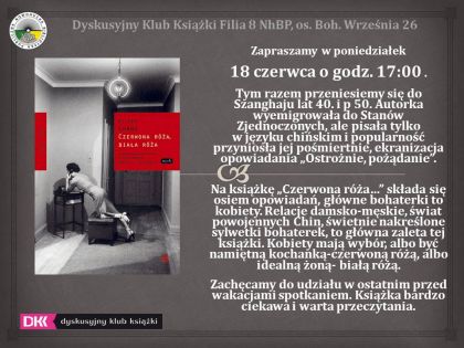 W czasie ostatniego przed wakacjami spotkania miłośnicy literatury będą rozmawiać o książce "Czerwona róża, biała róża" Eileen Chang.