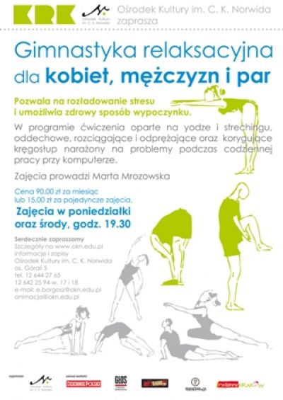 Gimnastyka relaksacyjna pozwala na rozładowanie stresu i umożliwia zdrowy sposób wypoczynku. W programie ćwiczenia oparte na yodze i strechingu, oddechowe, rozciągające i odprężające oraz korygujące kręgosłup narażony na problemy podczas codziennej pracy przy komputerze.