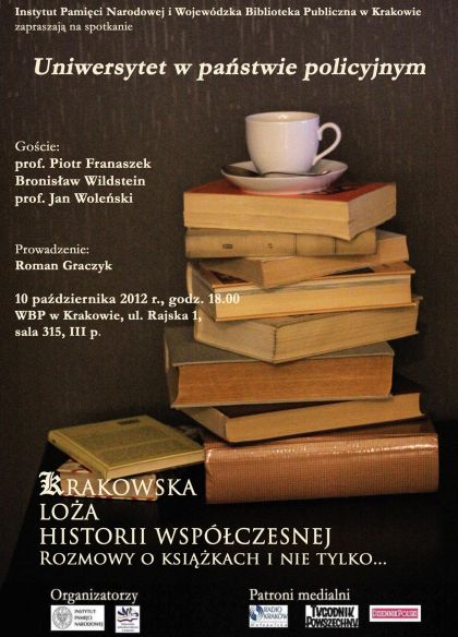 Instytut Pamięci Narodowej oraz Wojewódzka Biblioteka Publiczna w Krakowie zapraszają na spotkanie Uniwersytet w państwie policyjnym. W dyskusji na temat książki prof. Piotra Franaszka „Jagiellończyk”. Działania Służby Bezpieczeństwa wobec Uniwersytetu Jagiellońskiego w latach 80-tych XX wieku wezmą udział autor, Bronisław Wildstein oraz prof. Jan Woleński. Spotkanie prowadzi Roman Graczyk.
