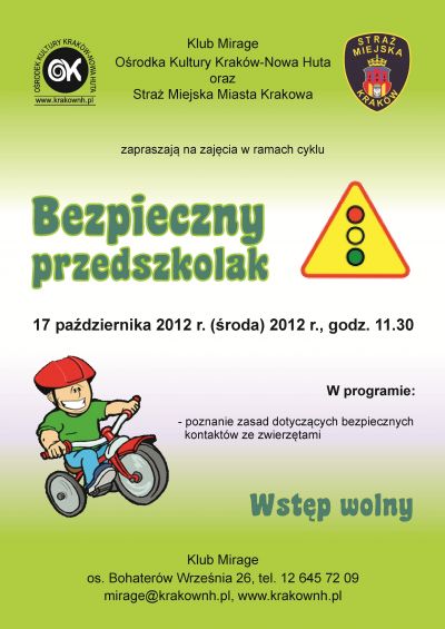 Klub Mirage Ośrodka Kultury Kraków-Nowa Huta (os. Bohaterów Września 26) zaprasza 17 października 2012 r. (środa) o godz. 11.30 na kolejne spotkanie z cyklu Bezpieczny przedszkolak.