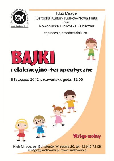 Klub Mirage Ośrodka Kultury Kraków-Nowa Huta (os. Bohaterów Września 26) zaprasza przedszkolaki na kolejne bajki terapeutyczno-relaksacyjne.