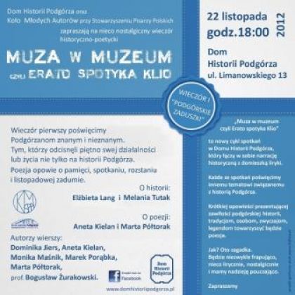 „Muza w muzeum czyli Erato spotyka Klio” to nowy cykl spotkań w Domu Historii Podgórza, który łączy w sobie narrację historyczną z liryki. Każde zespotkań poświęcone zostanie innemu tematowi związanemu z historią krakowskiego Podgórza.