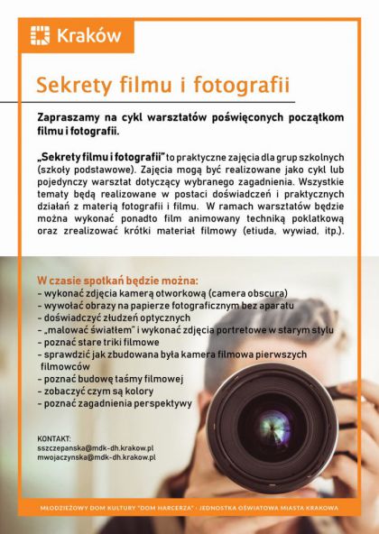 „Sekrety filmu i fotografii” to praktyczne zajęcia dla grup szkolnych (szkoły podstawowe). Zajęcia mogą być realizowane jako cykl lub pojedynczy warsztat dotyczący wybranego zagadnienia. Wszystkie tematy będą realizowane w postaci doświadczeń i praktycznych działań z materią fotografii i filmu.