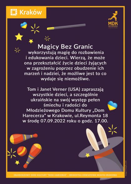 Tom i Janet Verner (USA) zapraszają wszystkie dzieci, a szczególnie dzieci ukraińskie na swój występ pełen śmiechu i radości do Młodzieżowego Domu Kultury „Dom Harcerza” w Krakowie, ul. Reymonta 18 w środę 7.09.2022 o godz.17.00