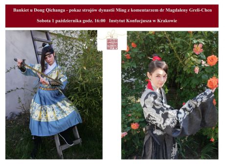 Instytut Konfucjusza w Krakowie serdecznie zaprasza w sobotę 1 października o godz. 16:00 na wydarzenie „Bankiet u Dong Qichanga czyli pokaz strojów dynastii Ming wraz z komentarzem dr Magdaleny Greli-Chen”.