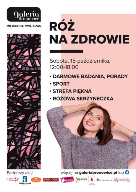 15 października, w godz. 12.00 - 18.00, w Galerii Bronowice odbędzie się wyjątkowa akcja dedykowana wszystkim kobietom „Róż na zdrowie”. W jej ramach będzie można m.in. skorzystać z bezpłatnych badań, porad dietetycznych, a nawet poznać techniki jogi twarzy. Na terenie centrum handlowego pojawi się także słynna Różowa Skrzyneczka ze środkami higieny osobistej. Klienci, którzy pomogą ją zapełnić, otrzymają w ramach podziękowania wrzos w doniczce.