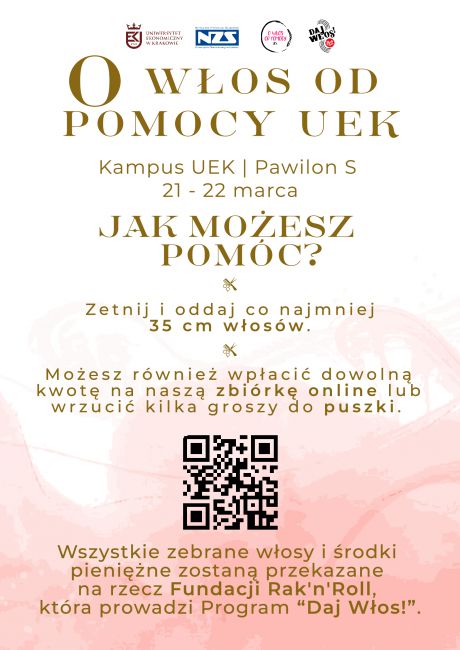 „O Włos od Pomocy UEK” to projekt charytatywny, dzięki któremu pragniemy pomóc osobom chorym na nowotwory w walce z chorobą. Ideą Projektu jest polepszenie jakości życia osób dotkniętych chorobą i sprawienie, że zyskają na pewności siebie. Podczas finału będą zbierane włosy od mieszkańców Krakowa i okolic, a także środki pieniężne na rzecz Fundacji Rak’n’Roll.