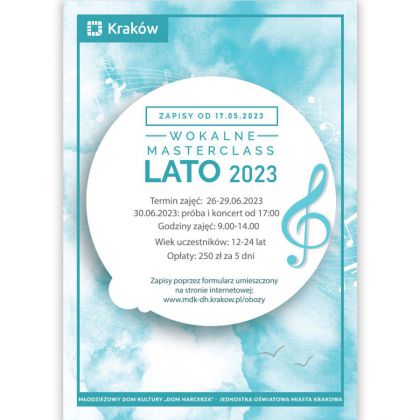 Zapraszamy młodzież w wieku od 12 do 24 lat na letnie zajęcia wokalno-aktorskie w formule kursu mistrzowskiego. Zajęcia odbywać się będą w terminie 26–30.06.2023 od poniedziałku do piątku w godzinach: poniedziałek - czwartek 9.00 - 14.00, w piątek próba od 17.00, a następnie koncert od 18.00. Wszystkie zajęcia będą odbywać się w budynku MDK „Dom Harcerza” przy ul. Reymonta 18.
