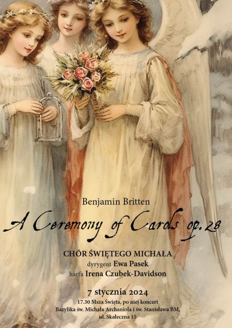 „A Ceremony of Carols” to niezwykły koncert bożonarodzeniowy w wykonaniu Chóru Św. Michała pod dyrekcją Ewy Pasek. W czasie koncertu wykonane zostaną utwory przeznaczone na nietypową i niezwykle efektowną obsadę - chór żeński i harfę. Koncert pozwoli na zanurzenie się w dwie muzyczne tradycje związane ze świętami Bożego Narodzenia. Wysłuchamy polskich kolęd i pastorałek opracowanych przez krakowskiego profesora św. pamięci Jacka Targosza oraz cyklu utworów bożonarodzeniowych angielskiego kompozytora Benjamina Brittena “A Ceremony of Carols”.