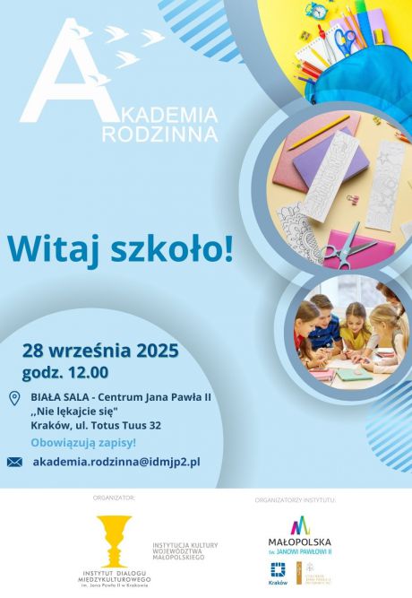 Instytut Dialogu Międzykulturowego im. Jana Pawła II w Krakowie serdecznie zaprasza na kolejne spotkanie w ramach Akademii Rodzinnej, które odbędzie się 28 września 2025 r. o godz. 12.00, zaraz po Mszy Świętej w Sanktuarium Świętego Jana Pawła II w Krakowie.