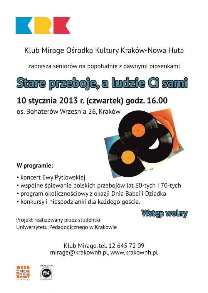 Klub Mirage Orodka Kultury Kraków-Nowa Huta (os. Bohaterów Wrzenia 26) zaprasza seniorów 10 stycznia 2012 r. o godz. 16.00 na popołudnie z dawnymi piosenkami.