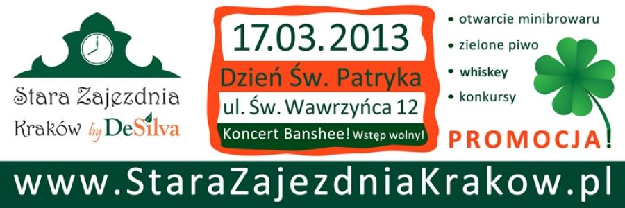 W niedzielę 17 marca br. o godz. 17:00 w Starej Zajezdni Kraków by DeSilva przy ul. w. Wawrzyńca 12 startuje prawdopodobnie najbardziej irlandzka impreza na Kazimierzu. To włanie tutaj w wielkiej hali z 1913 roku obchodzony będzie hucznie Dzień więtego Patryka połšczony z oficjalnš premierš warzonego na miejscu piwa! Wieczorem koncert zespołu pieni Irlandzkiej Banshee. Wstęp wolny!