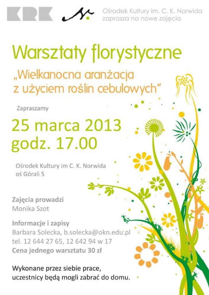 Serdecznie zapraszamy do Orodka Kultury im. C. K. Norwida na otwarte warsztaty florystyczne. Na zajęciach układamy kompozycje z kwiatów wieżych oraz suszonych, wczeniejsze przygotowanie nie jest konieczne, gotowe kompozycje będziecie Państwo mogli zabrać ze sobš do domu.