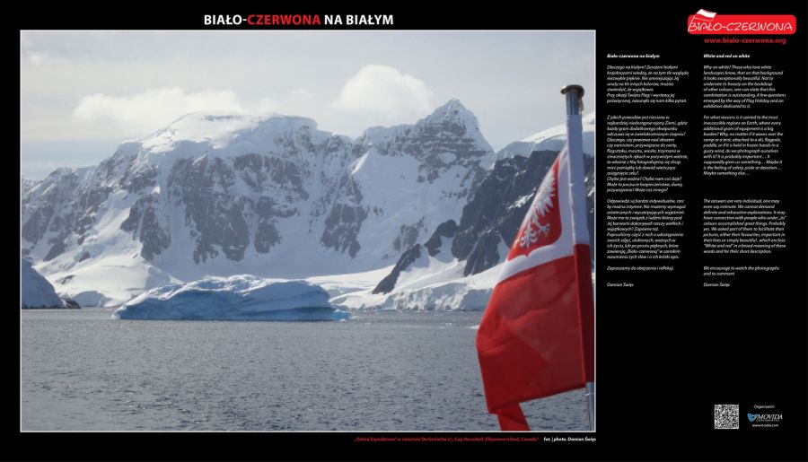 Wystawa Biało-czerwona na białym ukazuje dorobek Polaków w zakresie osišgnięć naukowych, a także często ekstremalnych wypraw i przedsięwzięć sportowych oraz podróżniczych. Na ekspozycji zaprezentowano polskie barwy narodowe w najbardziej niedostępnych miejscach na ziemi tam gdzie lód, nieg i mróz, stšd tytuł wystawy Biało-czerwona na białym. Swoje ulubione zdjęcia, upamiętniajšce ważne momenty w życiu opisali i udostępnili czołowi polscy naukowcy, podróżnicy, żeglarze polarni i alpinici m.in. Marek Kamiński, Adam Bielecki, czy Kinga Baranowska.