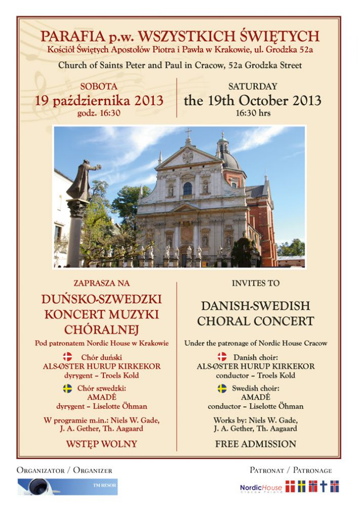 W sobotę 19 paŸdziernika, odbędzie się koncert chórów ze Szwecji i Danii, w Koœciele pw. S.S.Piotra i Pawła w Krakowie. Koncert objęty jest patronatem Konsula Honorowego Szwecji w Krakowie, Janusza Kahla.