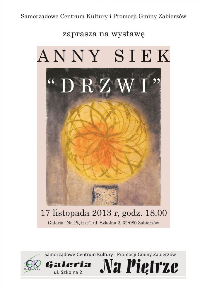Galeria "Na Piętrze" przy Samorzšdowym Centrum Kultury i Promocji Gminy Zabierzów /Zabierzów, koło Krakowa/ zaprasza na otwarcie wystawy Anny Siek pt. "Drzwi". Wernisaż odbędzie się 17 listopada o godz. 18:00 . Autorka zaprezentuje grafiki oraz malarstwo.