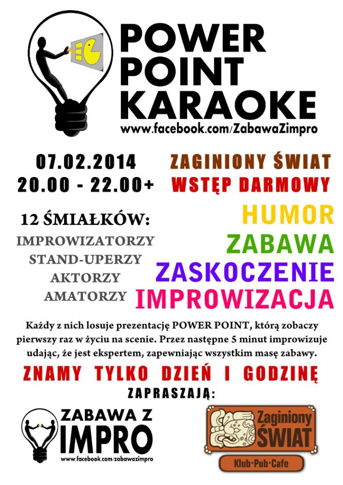 Każdy z nich losuje prezentację POWER POINT na losowy temat, nieznanš nigdy wczeœniej. Musi odrzucić wszelkie blokady i improwizujšc przekonać nas, że jest ekspertem w danym temacie. Powstanie masa pomyłek, masa nowych twierdzeń naukowych i masa œmiechu!
