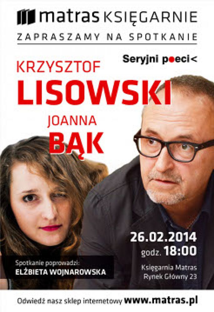 Księgarni Matras w Krakowie (Rynek Główny 23) najstarszej księgarni w Europie, liczšcej sobie 404 lata, odbędzie się kolejne spotkanie literackie z cyklu : Mistrz i Uczeń, a bohaterami wieczoru będzie : jako Mistrz znakomity poeta Krzysztof Lisowski, oraz młoda poetka Joanna Bšk.