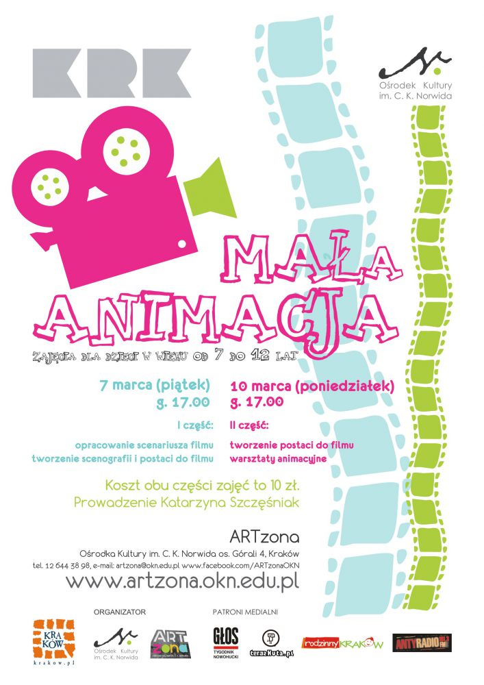 Serdecznie zapraszamy dzieci, które chciałyby poznać tajniki animacji filmowej. Jeli chcecie stworzyć własny film animowany, poznać jego tajniki krok po kroku, od pomysłu, prostego scenariusza poprzez realizację przyjdcie koniecznie do ARTzony. Podczas warsztatów spróbujemy wspólnie zrealizować krótki film animowany, stworzymy scenariusz, scenografię, postaci filmowe a póniej wykonujšc proste czynnoci przesuwania przedmiotów, wyciętych figur, stworzymy swojš autorskš animacje.