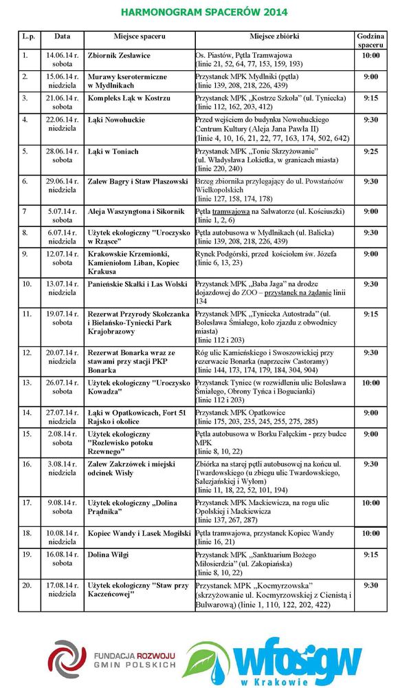 Fundacja Rozwoju Gmin Polskich zaprasza mieszkańców Krakowa oraz jego okolic do uczestniczenia w spacerach przyrodniczych organizowanych na terenie miasta Krakowa i okolic, które będš się odbywać w okresie czerwiec sierpień 2014 według poniższego harmonogramu: