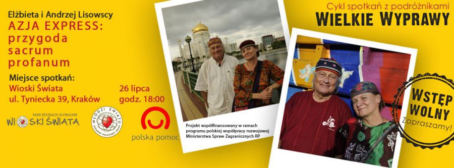 Goœćmi naszego już kolejnego spotkania będš Elżbieta oraz Andrzej Lisowscy, małżeństwo podróżników i dziennikarzy, którzy wspólnie od lat przemierzajš azjatyckie tereny œwiata. Każda ich podróż dostarcza nowych doœwiadczeń, wrażeń i przeżyć. Będš mieli okazję podzielić się nimi w czasie spotkania realizowanego w ramach cyklu Wielkie Wyprawy, którego celem jest przedstawienie szeroko pojmowanych wyzwań globalnych oraz współzależnoœci z nimi zwišzanych. Cykl ten powstał z inicjatywy ludzi zrzeszonych w Salezjańskim Wolontariacie Misyjnym “Młodzi Œwiatu”. Założeniem projektu jest zwrócenie uwagi na odpowiedzialnš turystykę oraz uwolnienie jednostek od stereotypowych postaw wobec innych kultur. Jednoczeœnie istotne staje się podkreœlenie wagi podejmowanych przez nas decyzji oraz ich wpływu nie tylko na nasze dalsze życie, ale również na przyszłoœci innych.