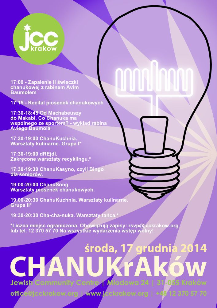 Już po raz drugi zapraszamy na obchody więta Chanuki! W tym roku przygotowalimy jeszcze więcej chanukowych atrakcji. Koncert, wykład, warsztaty, gry... A wszystko po to, żeby dowiedzieć się więcej o tym więcie.