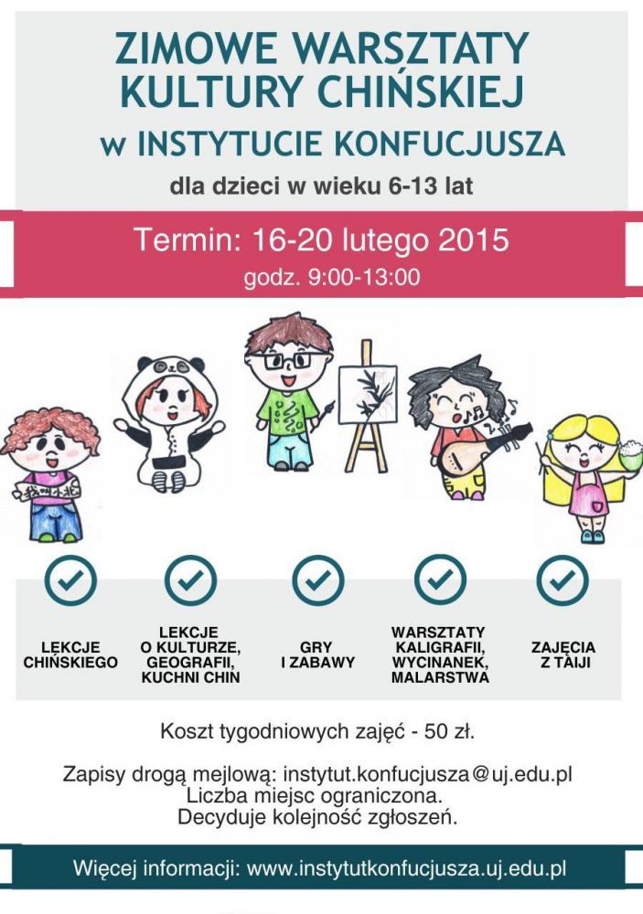 Instytut Konfucjusza w Krakowie serdecznie zaprasza dzieci uczęszczajšce do szkół podstawowych w wieku 6-13 lat do udziału w pięciodniowych warsztatach kultury chińskiej, które odbędš się w pierwszym tygodniu ferii (od poniedziałku 16 lutego do pištku 20 lutego, w godzinach 9:00-13:00) w siedzibie Instytutu Konfucjusza w Krakowie przy ul. Radziwiłłowskiej 4.