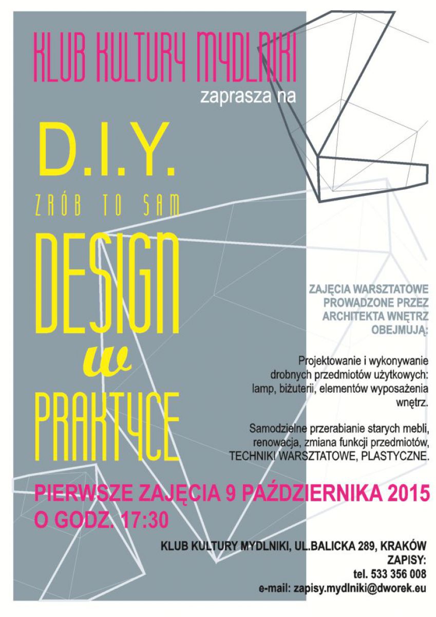 Jeżeli marzy Ci się projektowanie i wykonywanie drobnych przedmiotów, którymi odmienisz swoje mieszkanie lub uszczęœliwisz swoich najbliższych to przyjdŸ na warsztaty D.I.Y – zrób to sam, czyli design w praktyce. Nauczysz się jak tworzyć biżuterię, elementy wyposażenia wnętrz, samodzielnie przerobisz stare meble i nadasz koloru przedmiotom bez „życia”.