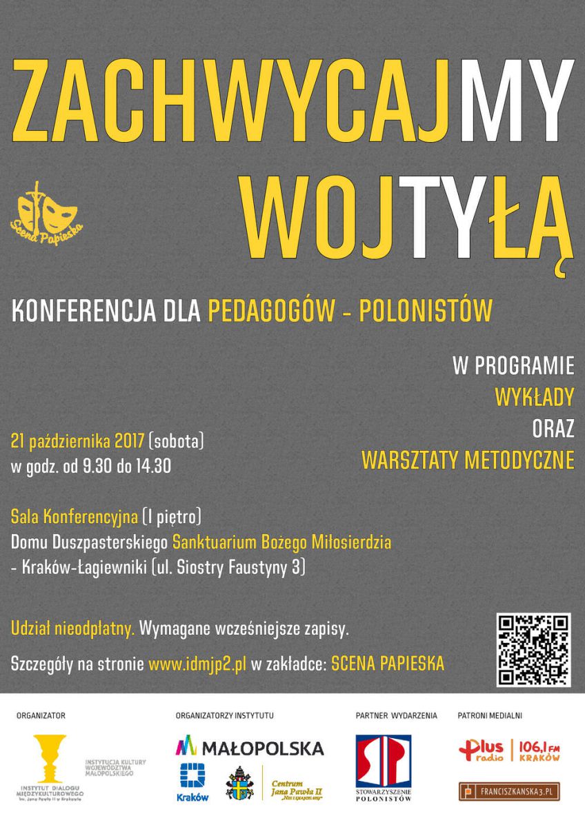 Scena Papieska Instytutu Dialogu Międzykulturowego im. Jana Pawła II w Krakowie serdecznie zaprasza pedagogów-polonistów do udziały w konferencji naukowo-metodycznej powięconej twórczoci literackiej Karola Wojtyły Jana Pawła II oraz jej obecnoci w szkole. Partnerem przedsięwzięcia jest Stowarzyszenie Polonistów.
