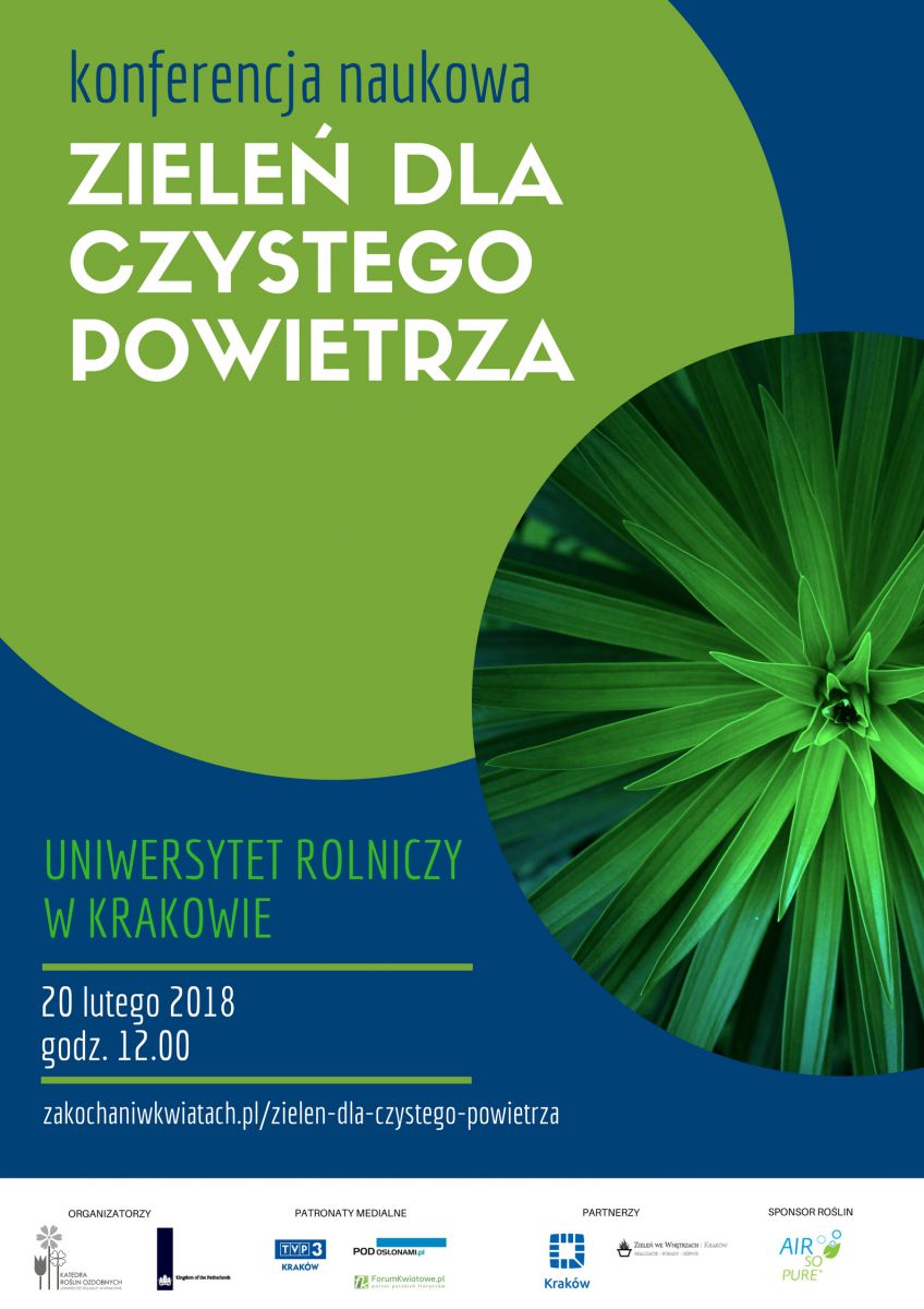 20 lutego 2018 odbędzie się konferencja naukowa Zieleń dla czystego powietrza organizowana przez Ambasadę Królestwa Niderlandów w Polsce i Katedrę Roœlin Ozdobnych Uniwersytetu Rolniczego im. Hugona Kołłštaja w Krakowie. Celem wydarzenia jest popularyzacja korzystnego wpływu roœlinnoœci na jakoœć powietrza i zdrowie człowieka. Partnerem konferencji jest Miasto Kraków.