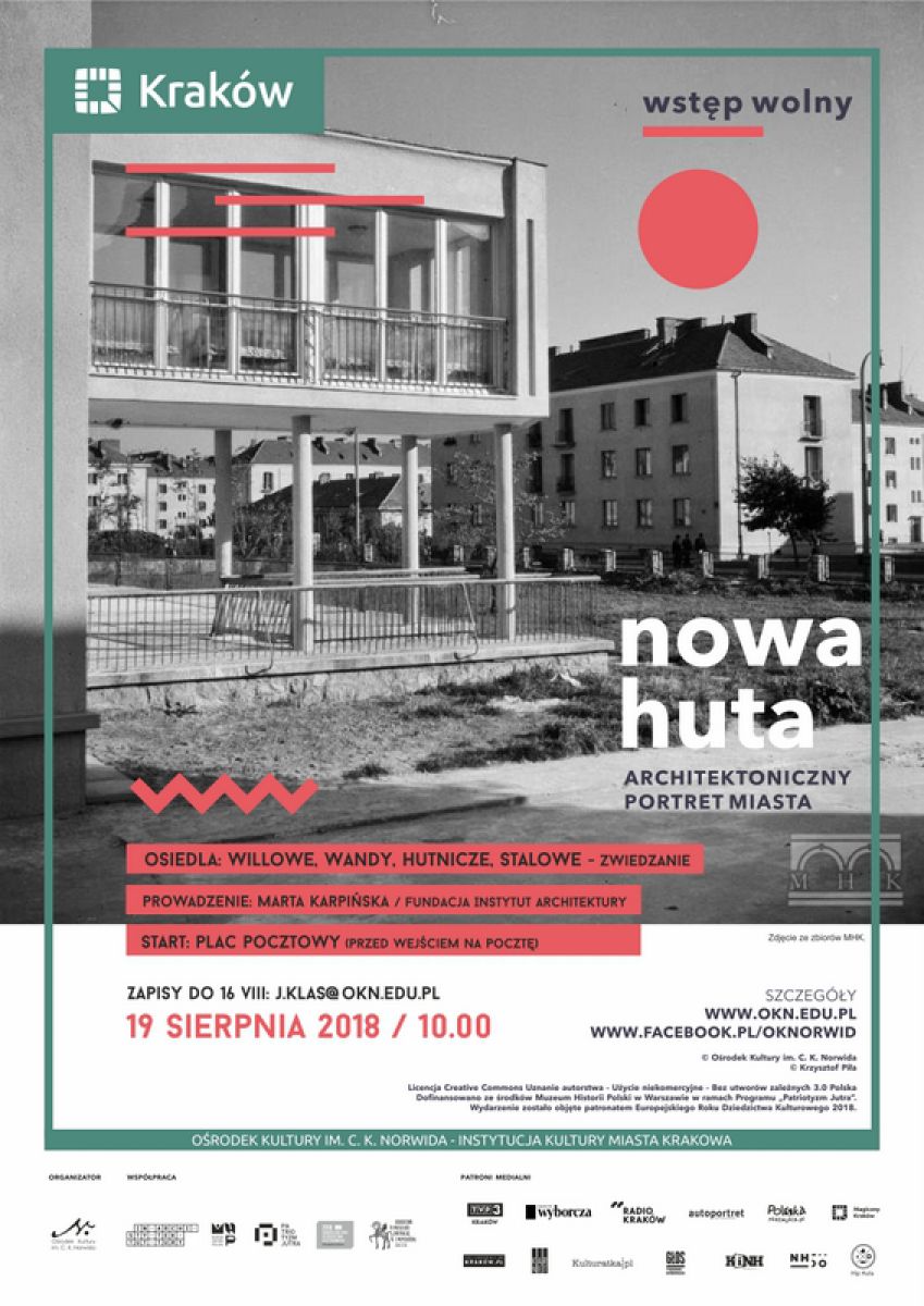 Zwiedzanie najstarszych osiedli Nowej Huty, pierwszych bloków prefabrykowanych i dawnego Domu Młodego Robotnika w ramach projektu Nowa Huta architektoniczny portret miasta. Prowadzenie: Marta Karpińska (Fundacja Instytut Architektury). Zapisy do 22 VIII. Wstęp wolny.