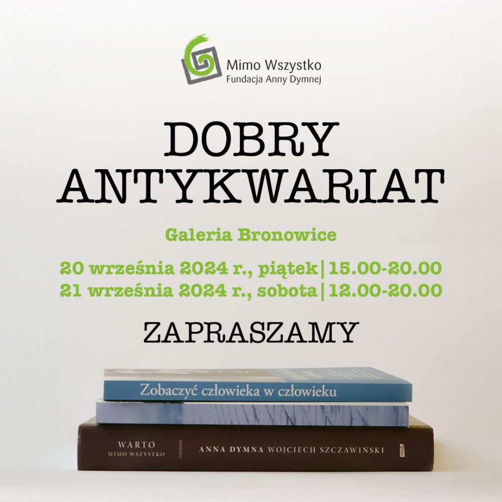 W piątek i sobotę, 20-21 września, w Galerii Bronowice wolontariusze Biura Młodych Fundacji Anny Dymnej „Mimo Wszystko” już po raz trzeci zorganizują „Dobry Antykwariat”. Projekt ma na celu podarowanie książkom drugiego życia i jednocześnie pomoc podopiecznym Fundacji. Chętni, którzy zdecydują się wesprzeć potrzebujących, przekazując dowolną darowiznę, będą mogli wybrać dla siebie jedną z książek dostępnych w antykwariacie. Na półkach znajdą się pozycje z kategorii beletrystyka, poezja, literatura dla dzieci, książki kucharskie czy obcojęzyczne, a także tomiki poezji, wydane w ramach Ogólnopolskiego Konkursu Poezji „Słowa, dobrze, że jesteście”.