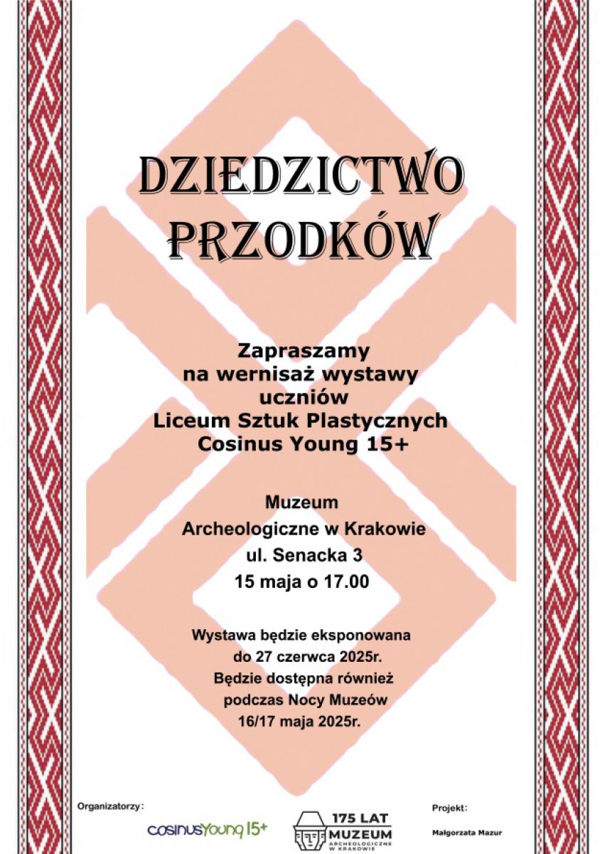 Naczynia, suknię oraz biżuterię ceramiczną, wykonaną przez uczniów Liceum Sztuk Plastycznych Cosinus w Krakowie wedle własnych pomysłów, ale barwą i wzornictwem nawiązujące do tradycji słowiańskiej, będzie można podziwiać w Muzeum Archeologicznym przy ul. Senackiej 3 w Krakowie. Wernisaż wystawy „Dziedzictwo przodków” odbędzie się w czwartek 15 maja 2025 roku o godz. 17-tej.