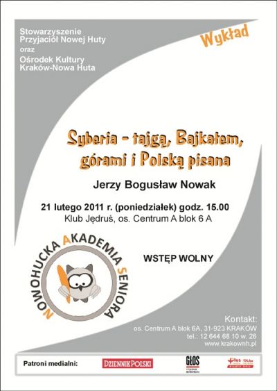 Syberia. Kraina ta od zawsze fascynowała i rozpalała wyobraŸnię wielu podróżników. Po feryjnej przerwie, Nowohucka Akademia Seniora zaprasza wszystkich ciekawych œwiata na spotkanie z podróżnikiem Jerzym Bogusławem Nowakiem. Na wykładzie, któremu towarzyszyć będzie pokaz multimedialny, poznać będzie można tę tajemniczš i niedostępnš krainę.