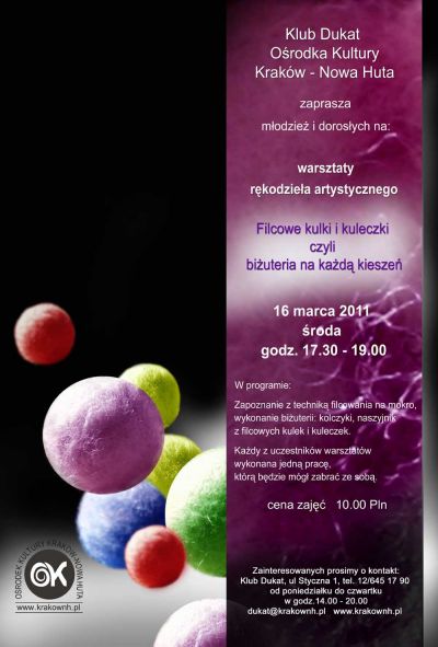 16 marca 2011 r. o godz. 17.30 Klub Dukat Orodka Kultury Kraków - Nowa Huta (ul. Styczna 1) zaprasza na warsztaty rękodzieła artystycznego.