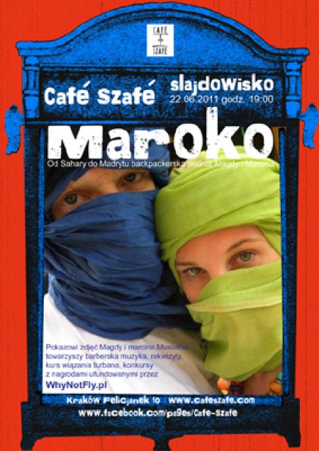 Podczas spotkania Magda i Marcin zaprezentujš zdjęcia ze swojej wyprawy, a wydarzeniu temu towarzyszyć będzie berberska muzyka oraz marokańskie rekwizyty. Chętni będš mogli nauczyć się wišzać turban, powšchać marokańskie przyprawy i zanurzyć dłoń w piasku Sahary. Najbardziej aktywna częœć publicznoœci będzie miała dodatkowo okazję skosztować berberskš whisky, z oryginalnego srebrnego naczynia zdobytego na suku w Marrakeszu. Podczas spotkania planowane sš również upominki od partnerów wydarzenia: Centrum Nurkowego Nautica i portalu WWW.WhyNotFly.pl