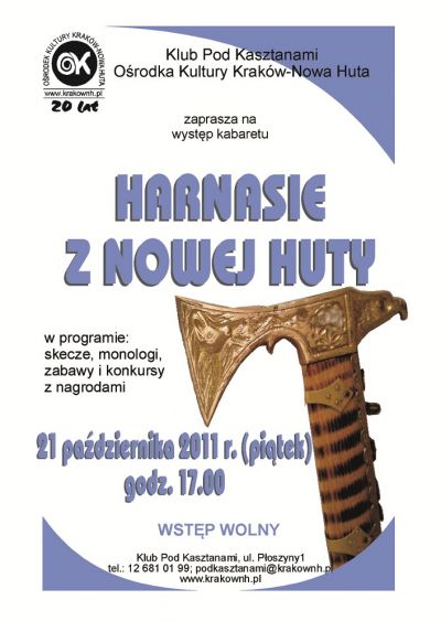 Klub Pod Kasztanami Oœrodka Kultury Kraków-Nowa Huta (ul. Płoszczyny 1) zaprasza na występ Kabaretu Harnasie z Nowej Huty.
