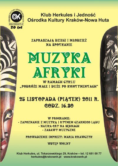 Klub Herkules Orodka Kultury Kraków-Nowa Huta (ul. Tokarzewskiego 29) zaprasza 25 listopada (pištek) 2011 r. o godz. 16.30 na kolejne spotkanie w ramach projektu Podróże małe i duże po kontynentach powięcone Muzyce Afryki.