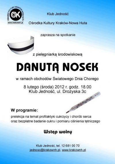 Serdecznie zapraszamy wszystkich mieszkańców os. Wolica na spotkanie z pielęgniarkš œrodowiskowš w ramach obchodów Œwiatowego Dnia Chorego. W programie: pogadanka na temat profilaktyki cukrzycy i chorób serca oraz bezpłatne badanie cukru, pomiar ciœnienia tętniczego.