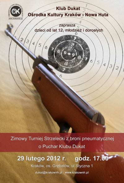Klub Dukat Orodka Kultury Kraków-Nowa Huta (ul. Styczna 1) zaprasza 29 lutego (roda) 2012 r. o godz. 17.00 na turniej strzelecki z broni pneumatycznej.