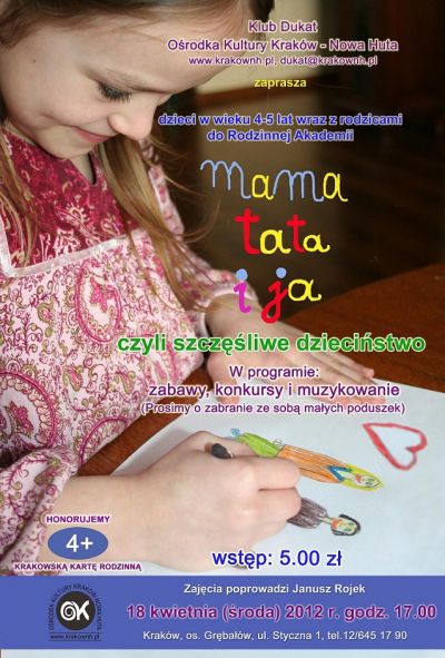 Klub Dukat Orodka Kultury Kraków-Nowa Huta (ul. Styczna 1) zaprasza rodziców z dziećmi w wieku 4-5 lat na drugie spotkanie w ramach Rodzinnej Akademii.